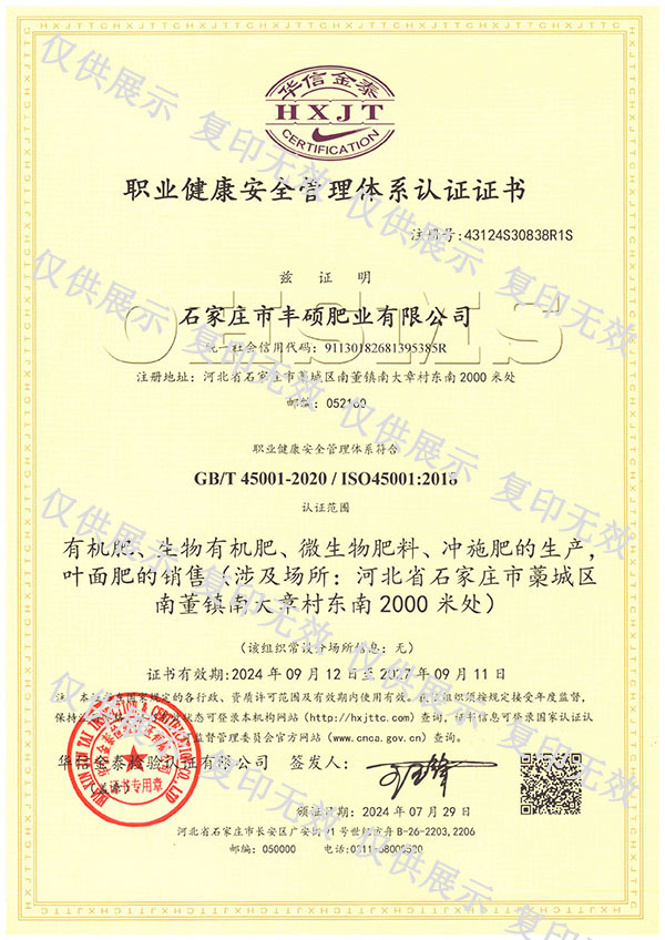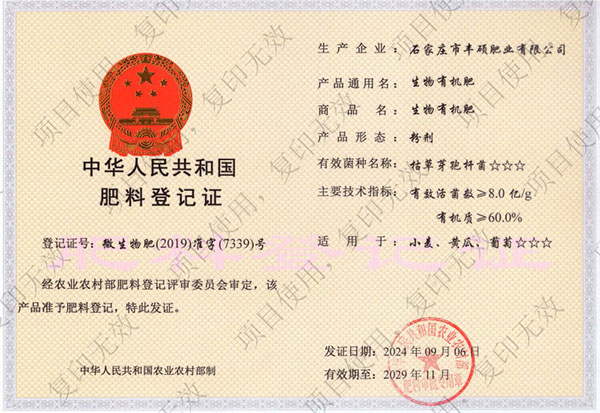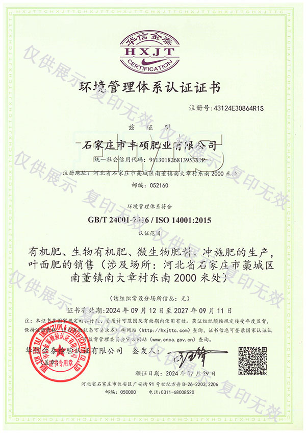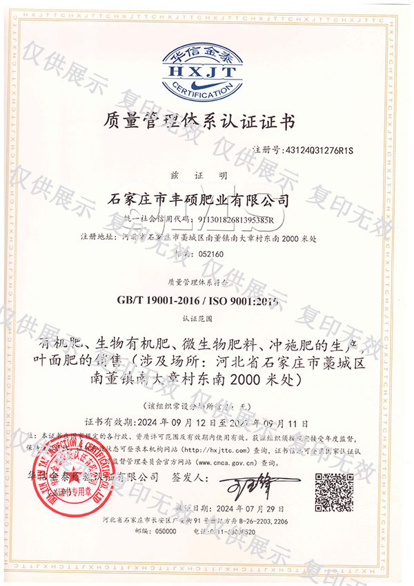 石家莊市豐碩肥業(yè)有限公司是一家集新型肥料的研發(fā)、制造、營銷、服務(wù)于一體的高新技術(shù)企業(yè),公司自2008年創(chuàng)辦以來,一直致力于新型肥料的技術(shù)研發(fā)和市場推廣。公司組建了豐碩新型肥料研究中心(院士專家企業(yè)工作站),自主知識產(chǎn)權(quán)研發(fā)團(tuán)隊(duì)專業(yè)科研人員20余人,獲得了多項(xiàng)肥料國家發(fā)明專利。公司目前已擁有發(fā)酵類有機(jī)肥、微生物菌劑、生物有機(jī)肥、土壤調(diào)理劑、大量元素水溶肥、含腐植酸肥料、含氨基酸肥料、中微量元素肥料等8大品類,“金維克”、“豐碩沃農(nóng)”等2大自有品牌,擁有20多個暢銷品種。目前,我公司已經(jīng)通過了“ISO9001 質(zhì)量管理體系認(rèn)證”、“ISO14001 環(huán)境管理體系認(rèn)證”、“OHSAS18001 職業(yè)健康管理體系認(rèn)證”。...